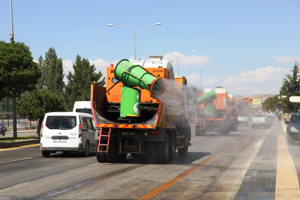 Çubuk'ta cadde ve sokaklar, Mamak Belediyesi'nin katkılarıyla "Covid-19 Savar" adı verilen basınçlı sistemle dezenfekte edildi.