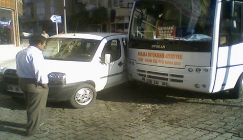 Çubuk'ta köprübaşı kavşağında bir halk otobüsü ile 06 AD 6980 plakalı Fiat Doublo çarpıştı.