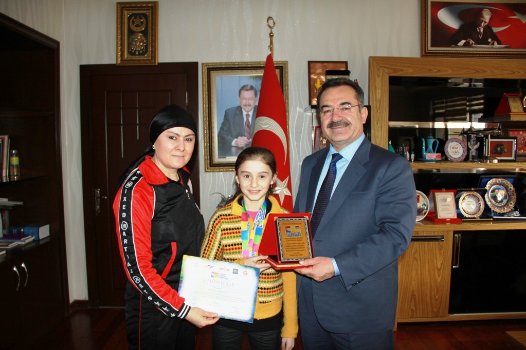 Başkan Acehan’ı makamında ziyaret eden minik taekwondocu Beyzanur Ağaören, Avrupa’da ilk defa yapılan Avrupa Minikler Açık Taekwondo Şampiyonasına katılmanın ve Avrupa 2’incisi olmanın mutluluğunu yaşadığını söyledi.