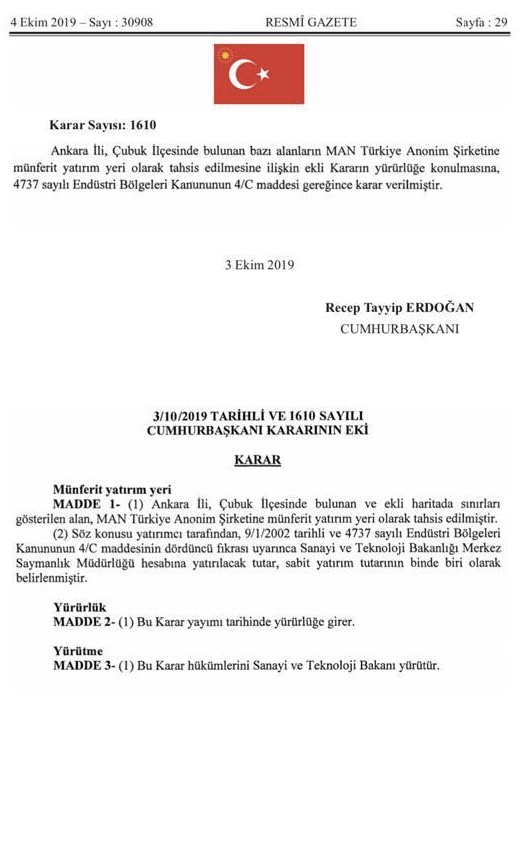 Man Türkiye A.Ş' nin ilçemizde yapacağı yatırım konusundaki ilgili kurumlarca gerekli izinler bugünkü Resmî Gazetede yayımlandı.