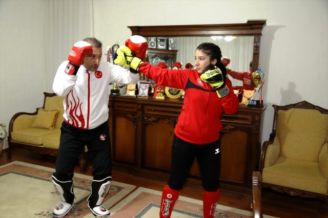 Çubuk ilçesinde 38 yaşındaki milli antrenör Halit Erdemir, birlikte Avrupa şampiyonasına hazırlanan yeğeni Fahriye Erdemir ile evde her gün spor yaparak çalışmalarını sürdürüyor.
