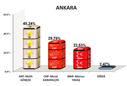 Ankara'da AK Parti İstanbul kadar farklı değil. Melih Gökçek yüzde 45.24 oyla seçimi kazanıyor. CHP adayı Murat Karayalçın yüzde 29.76 oyla ikinci sırada yer alıyor.