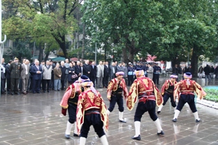 Ulu Önder ve silah arkadaşlarının huzurunda saygı duruşu ve istiklal marşı ile başlayan tören, Atatürk anıtına Kaymakamlık, Garnizon Komutanlığı ve Belediye Başkanlığının çelenk koymasının ardından, günün anlam ve önemini anlatan konuşmalarla devam etti. Konuşmaların ardından Yavuz Selim İlköğretim Okulu Halk Oyunları ekibinin Seğmen gösterileri sergilendi.