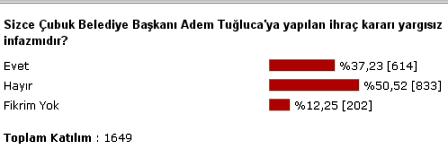 "Sizce Çubuk Belediye Başkanı Adem Tuğluca'ya yapılan ihraç kararı yargısız infazmıdır? şeklinde düzenlediğimiz anketin sonuçlarını açıklıyoruz.
