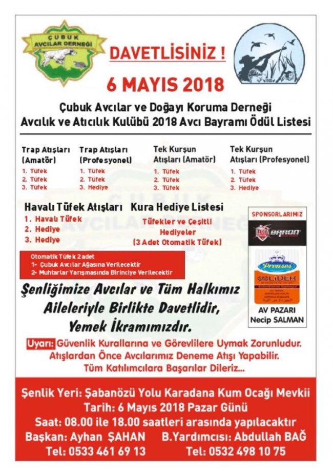 Çubuk Avcılar ve Doğayı Koruma Derneği, 06 Mayıs'da yapılacak Çubuk Avcılık Şenliği ve Yarışmaları için hazırlıklarını tamamlarken, tüm başkentlileri şenliğe davet ettiler.