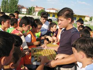 Daha sonra minik futbolculara baklava ikram ederek, hatıra fotoğrafı çektirdi ve ardından da minik futbolcuları test etmek için penaltı çekti.