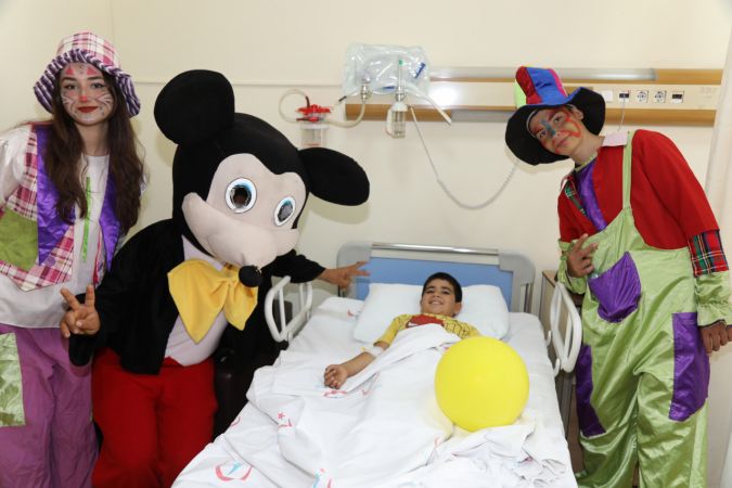 Balonlarla süslenen hastanenin girişinde palyaçolar tarafından karşılanan çocuklar işlemlerin ardından yine palyaçolar tarafından ameliyathaneye kadar götürülüyor.
