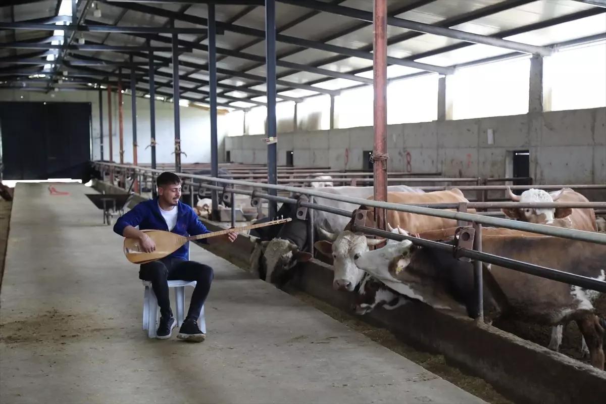 Çubuk'ta yaşayan 23 yaşındaki besici, büyükbaş hayvanları için saz çalıp türkü seslendiriyor.