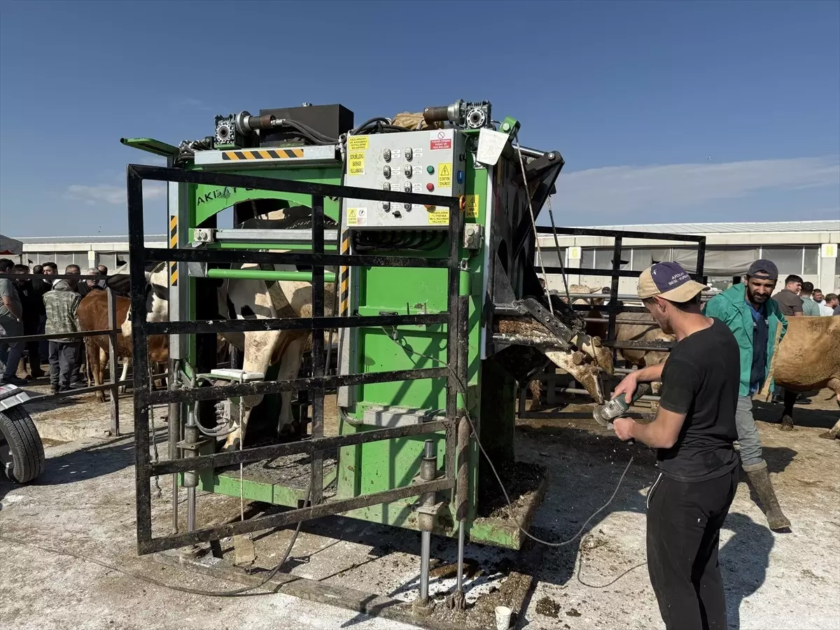 Çubuk'ta hayvan pazarlarında mobil araçta büyükbaş hayvanlar için tırnak kesim ve bakım hizmeti sunuluyor.