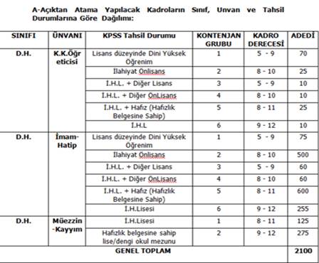 633 sayılı Diyanet İşleri Başkanlığı Kuruluş ve Görevleri Hakkında Kanunun 6002 sayılı kanunla değişik 10 uncu maddesinin 5. fıkrası ile aynı Kanuna 6002 sayılı kanunun 20 nci maddesi ile eklenen geçici 14 üncü maddesi uyarınca; Diyanet İşleri Başkanlığına ait boş kadrolardan aşağıda Sınıfı, Unvanı, Tahsil Durumları, kadro derecesi ve adedi belirtilen toplam 2100 kadroya KPSS (B) grubu puan sırasına göre her bir unvan için boş kadro sayısının üç katına kadar çağrılacak adaylar arasından Başkanlıkça yapılacak sözlü-uygulamalı sınav sonucu başarı sırasına göre açıktan atama yapılacaktır.