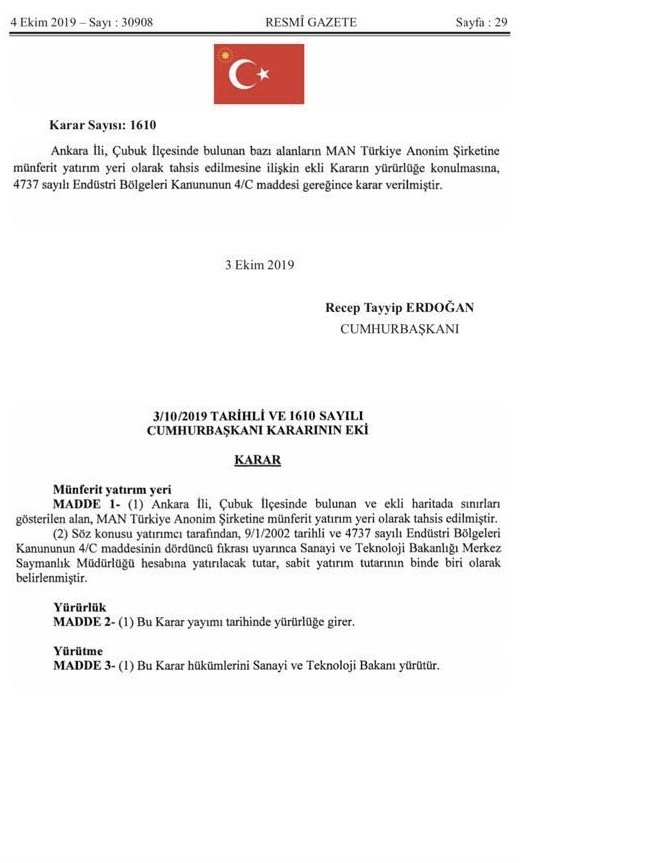 Man Türkiye A.Ş' nin ilçemizde yapacağı yatırım konusundaki ilgili kurumlarca gerekli izinler bugünkü Resmî Gazetede yayımlandı.