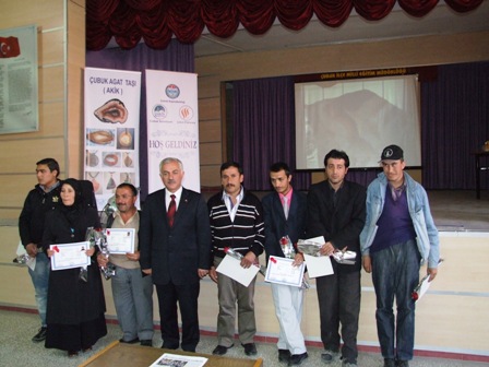 Ankara da bir ilk olan ve 6 ay boyunca süren, Türkiye'nin en iyi teknolojisine sahip olduğu ileri sürülen Çubuk Değerli Taş İşleme merkezimizde taş kesme, işleme ve parlatma teknikleri eğitimi gören kursiyerlere sertifikaları Kaymakam Meftun Dallı"nın da katılımı ile törenle verildi. Törenden sonra kursiyerlerle hatıra fotoğrafı çekildi.