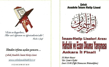 İmam-Hatip Liseleri arası" hafızlık ve ezan okuma" yarışması Ankara il finalı bu yıl Çubuk Anadolu İmam Hatip Lisesi'nin ev sahipliğinde yapılacak.