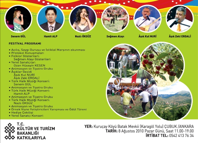 Ayrıca bütün hayallerin üzerine kurulduğu vişnenin Pazar payının yükseltilerek üreticilere bir katkının sağlanması hedeflenmektedir. Festivalimizde üreticilerimiz en güzel vişnelerini gelen misafirlere tattırdığı gibi satışa da sunacaktır. Eğlencenin de hat safhada olduğu festivalimizde, Ankara Kulübü Seğmen Alayı gösterileri, Kültür ve Turizm Bakanlığı Ankara Devlet Halk Müziği ve Klasik Türk Müziği Sanatçılarından Senem Gül, Hamit Alp,Nazlı Öksüz , aşıklar dan ,Aşık Kul Nuri ve Aşık Zeki Erdali nin katılacağını ifade etti.