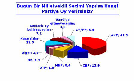 "Bugün seçim olsa kime oy verirsiniz?" sorusunun yöneltildiği seçmenlerin; kararsızlar, cevap vermeyenler ve sandığa tepki gösterenler dağıtılmaksızın yüzde %41,9"u AK Parti"ye, %13,9"u CHP"ye ve %8,4"ü MHP"ye oy vereceği cevabını verdi. Kararsızların yüzde 12, 5 oranında çıktığı ankette, Geçersiz oy kullanacağım diyenlerin oranı ise; yüzde 7.2.