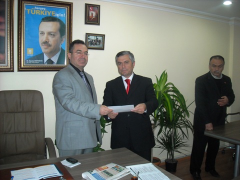 Murat Aslan Aday Adaylığı için müracaatını yaptıAk Parti den Belediye Başkanlığına aday adayı olan Murat Aslan Aday Adaylığı müracaat dilekçesini İlçe Başkanı Tuncay Acehan'a verdi.