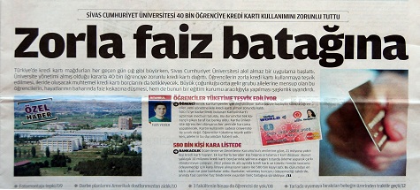 Sivas Üniversitesi Rektörlüğü aracılığıyla bütün üniversiteli gençlere kredi kartı dağıtılır. Bunu birinci haber yapan gazete; “zorla faiz batağına” başlığı ile büyük manşetten okuyucularına duyurur.