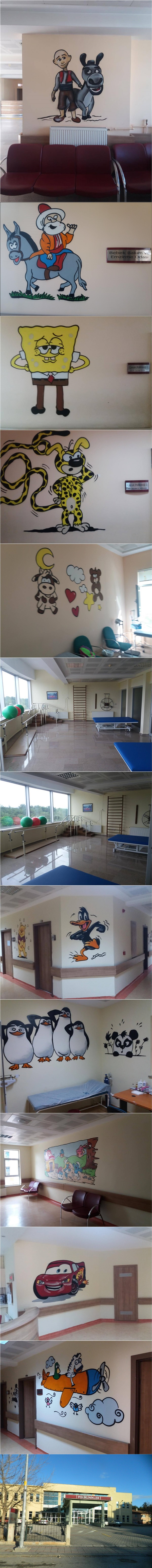 • Hastanemizin tüm servisleri ve acil servis bölümünün tamamı boyatılmış olup özellikle çocuk servisi ve polikliniği çocuklara yönelik çizgi film karakterleriyle resimize edilmiştir. (Hasta çocukların hastane korkularını yenmeleri için.)