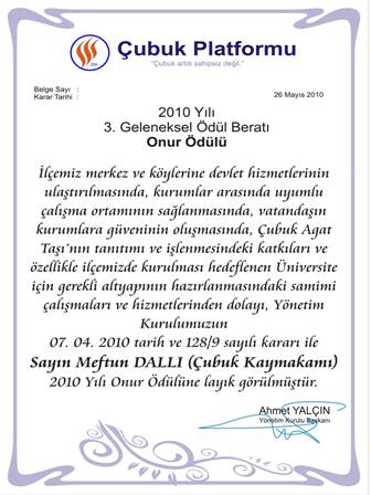 Her yıl bir kişiye verilen Onur Ödülü; İlçemiz merkez ve köylerine devlet hizmetlerinin ulaştırılmasında, kurumlar arasında uyumlu çalışma ortamının sağlanmasında, vatandaşın kurumlara güveninin oluşmasında, Çubuk Agat Taşı'nın tanıtımı ve işlenmesindeki katkıları ve özellikle ilçemizde kurulması hedeflenen Üniversite için gerekli altyapının hazırlanmasındaki samimi çalışmaları ve hizmetlerinden dolayı, Çubuk Kaymakamı Meftun Dallı'ya, verildi.