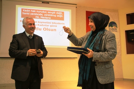 Konferansın ardından Başkan Özden, Ankara İl Gıda, Tarım ve Hayvancılık Müdürü tarafından düzenlenen kadın çiftçilerin bilgi ve birikimlerinin yarıştırıldığı 'Kadın Çiftçiler Yarışıyor' bilgi ve proje yarışmasında Ankara birincisi olan Çubuklu kadın çiftçi Aşkın Kavasoğlu’na ve Eğitimci Yazar Nurten Ceceli Alkan’a plaket ve Çubuk agat taşından yapılan kolye takdim etti.
