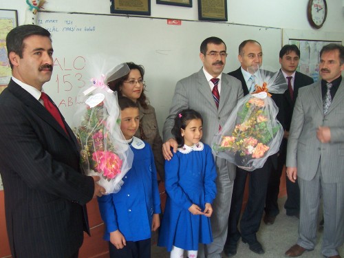 Öğrencilerle Uzun uzun sohbet eden Belediye Başkanı ve İlçe Milli Eğitim Müdürü sohbet sonunda öğrencilere çeşitli hidiyeler dağıttılar.