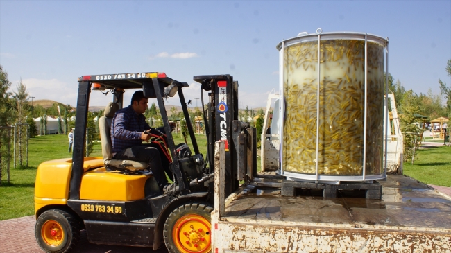Guinness Rekorlar Kitabı için hakem heyetinin huzurunda açılacak 1,5 ton turşunun bulunduğu dev turşu kavanozu, festival alanına getirildi.